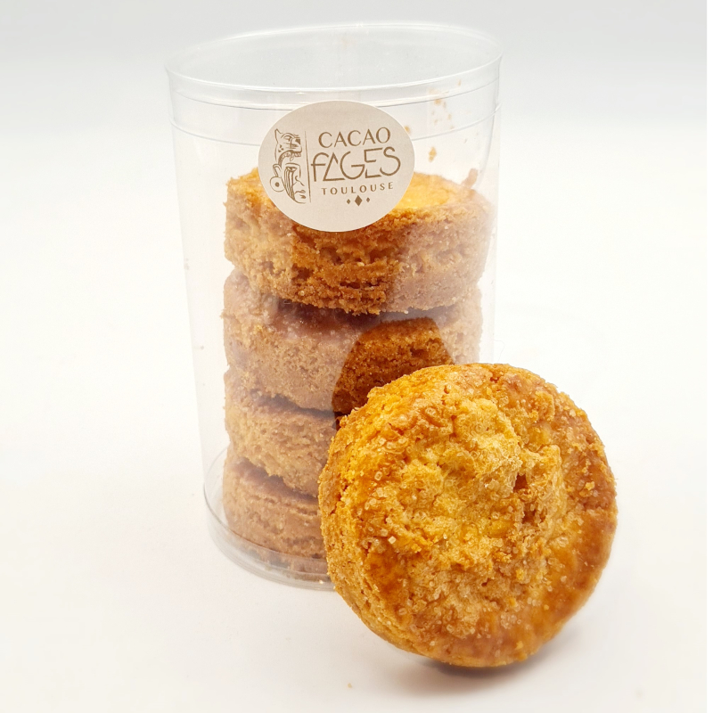 5 PALETS BRETONS : farine de blé, beurre pâtissier, sucre, jaune d’œuf, poudre à lever (diphosphate disodique (E450i), carbonate, acide de sodium (E500ii)), amidon de blé, fleur de sel.