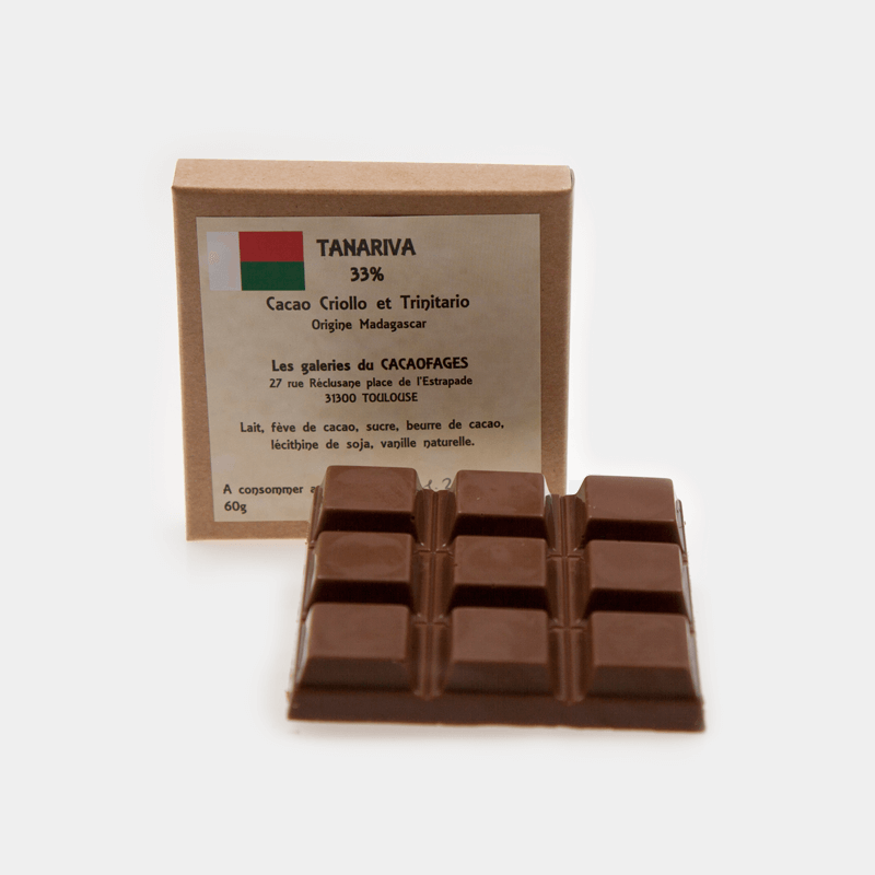 Variété « Criollo et Trinitario”, origine Madagascar, 33% de cacao.